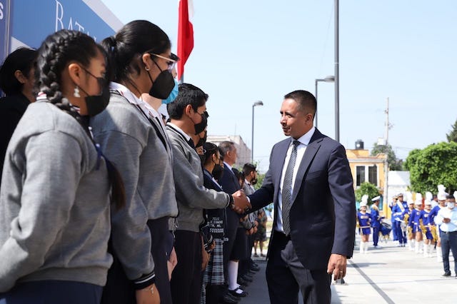 San Andrés Cholula, Puebla. – El alcalde Edmundo Tlatehui, encabezó la Ceremonia Cívica de Mayo, donde entregó reconocimientos a maestras con una trayectoria de 20 años en la docencia y premió a los alumnos ganadores del concurso de ilustración «Corazones Alegres».