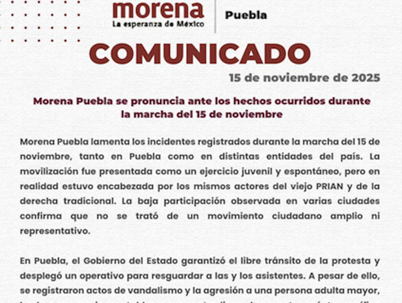 Morena Puebla lamentó los incidentes registrados durante la marcha del 15 de noviembre, tanto en Puebla como en distintas entidades del país. La movilización fue presentada como un ejercicio juvenil y espontáneo, pero en realidad estuvo encabezada por los mismos actores del viejo PRIAN y de la derecha tradicional. La baja participación observada en varias ciudades confirma que no se trató de un movimiento ciudadano amplio ni representativo.