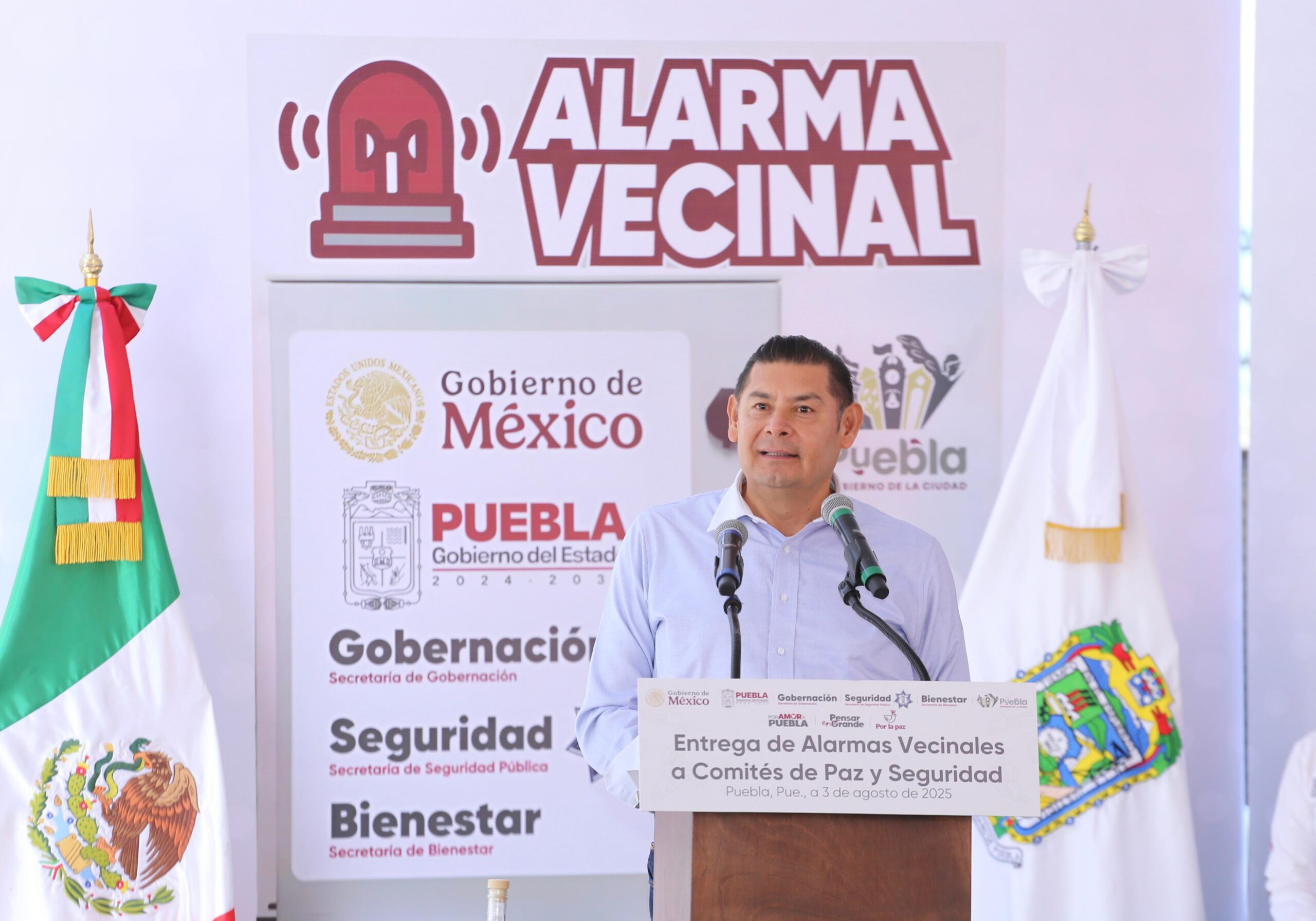 CIUDAD DE PUEBLA, Pue.- Con la visión de transformar los espacios públicos en entornos de paz, tranquilidad y bienestar, el gobernador de Puebla, Alejandro Armenta, entregó 100 Alarmas a Comités de Paz y Seguridad en la junta auxiliar San Baltazar Campeche, donde aseguró que dichos comités son guardianes y colaboradores del gobierno. «Nuestra prioridad es proteger a las y los poblanos», afirmó.