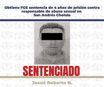 La Fiscalía General del Estado de Puebla informó que obtuvo sentencia condenatoria de 4 años de prisión en contra de Josué Roberto N., responsable del delito de abuso sexual cometido en agravio de una adolescente, en el municipio de San Andrés Cholula.