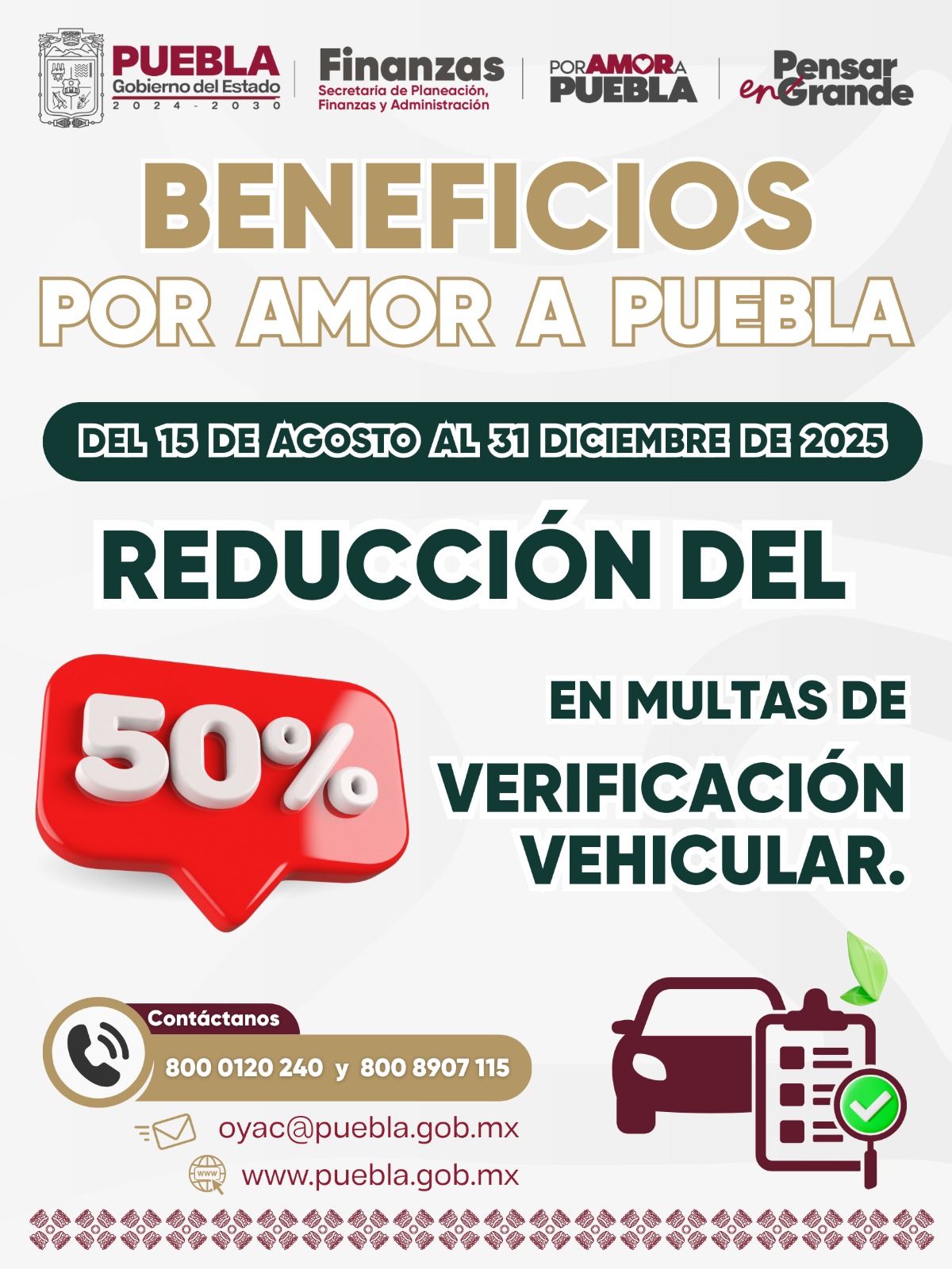 CIUDAD DE PUEBLA, Pue.- El Gobierno del Estado de Puebla otorgará una reducción del 50 por ciento en las multas por no aprobar la verificación vehicular de gases contaminantes y en las multas por la verificación extemporánea.