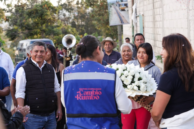 San Andrés Cholula, Puebla. – Una comisión de vecinos de la junta auxiliar de SanAntonio Cacalotepec, recibió a Lupita Cuautle Torres, a la que le entregaron un ramo de flores, y acto seguido la alcaldesa inauguró las obras de ampliación de drenaje sanitario y la red eléctrica en calles de esta junta auxiliar.