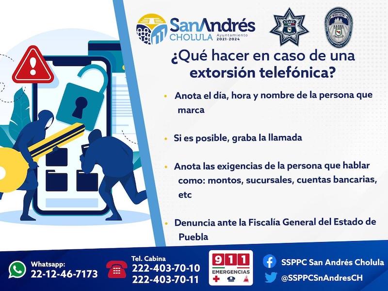 San Andrés Cholula, Pue.- Con el propósito de prevenir que las familias sanandreseñas sean víctimas del delito de extorsión, la Secretaría de Seguridad Pública y Protección Ciudadana (SSPPC) de San Andrés Cholula, a través de la Dirección de Prevención del Delito y Atención a Víctimas, emite las siguientes recomendaciones: