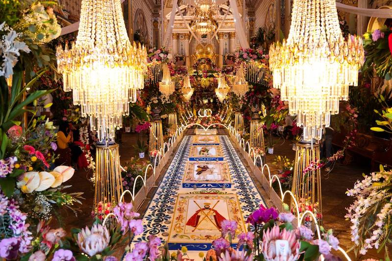 San Andrés Cholula, Pue.- Imponente alfombra lució en el templo de la parroquia de San Andrés, elaborada por los fieles en honor a la Virgen de los Remedios, y que patentiza la profunda fe de los habitantes en ella, y que fue el marco de la Feria Patronal 2025.
