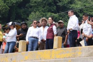 audia Sheinbaum, encabezó un recorrido por las zonas afectadas por las lluvias de hace unos días. Recorrió las calles, el puente dañado y el albergue instalado en el Ejido Carrizal Viejo.