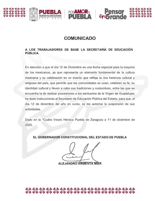 Ciudad de Puebla.- En comunicado, la Secretaría de Educación Pública (SEP), dio a conocer que la suspensión en las escuelas públicas este 12 de diciembre, por la festividad de la Virgen de Guadalupe, una tradición arraigada en la sociedad mexicana. La autorización no incluye a las escuelas privadas o particulares, pues no son trabajadores de base de la SEP.