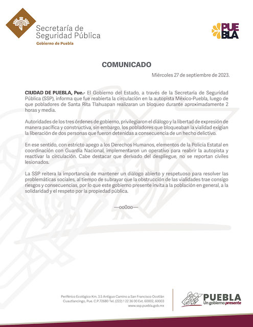 DiarioSinSecretos.com El Gobierno del Estado, a través de la Secretaría de Seguridad Pública (SSP), informa que fue reabierta la circulación en la autopista México-Puebla, luego de...