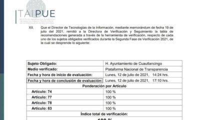 Diariosinsecretos.com Cuautlancingo, Pue.- El Ayuntamiento obtuvo el 100 por ciento en materia de transparencia, informó la alcaldesa Lupita Daniel Hernández, luego de ser notificado por el...