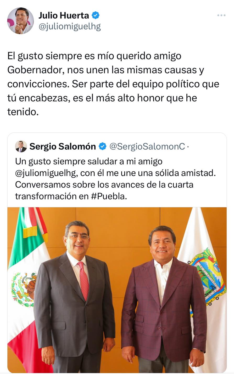 DiarioSinSecretos.com Ciudad de Puebla.- El gobernador Sergio Salomón, y su amigo el Exsecretario de Gobernación, Julio Huerta, a quienes los unen las mismas causas, se reunieron...