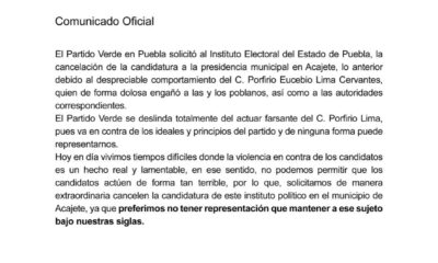 Diariosinsecretos.com El Partido Verde en Puebla lanzó un comunicado donde da a conocer que ya solicitó al Instituto Estatal Electoral la cancelación de la candidatura a...