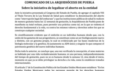 Diariosinsecretos.com La Arquidiócesis de Puebla, en carta pública, rechaza la propuesta de diputada morenista al Congreso del Estado de aprobar la “interrupción del embarazo” y...
