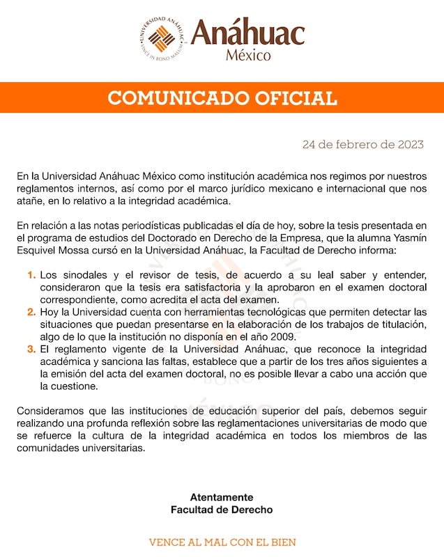 La casa de estudios, en respuesta, señaló en comunicado: “El reglamento vigente de la Universidad Anáhuac, que reconoce la integridad académica y sanciona las faltas, establece que a partir de los tres años siguientes a la emisión del acta del examen doctoral, no es posible llevar a cabo una acción que la cuestione”.